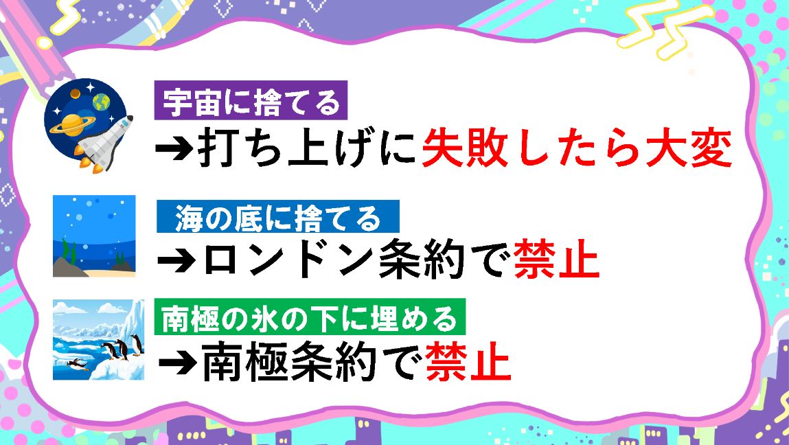グーモ 答えは「宇宙に捨てる」「海の底に捨てる」「南極の氷の下に埋める」などです。