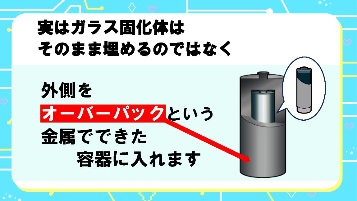 グーモ ガラス固化体は、オーバーパックという金属でできた容器に入れます。埋める際には緩衝材で包みます。この緩衝材は水に触れると吸い込んで膨らむベントナイトという素材を使っていて、地下水の浸入を防ぎます。