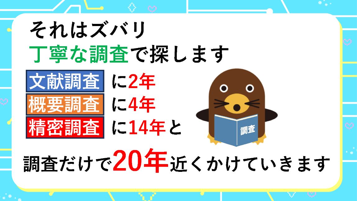 グーモ 丁寧な調査で探します。文献調査に2年、概要調査に4年、精密調査に14年と、調査だけで20年近くかけていきます。