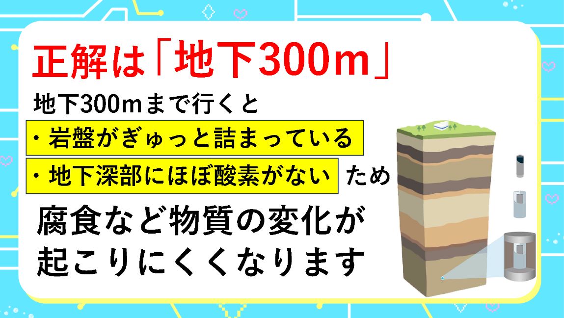 グーモ 正解は地下300メートル。地下深くの岩盤はぎゅっと詰まって、ほぼ酸素がないので、腐食など物質の変化が起こりにくくなります。