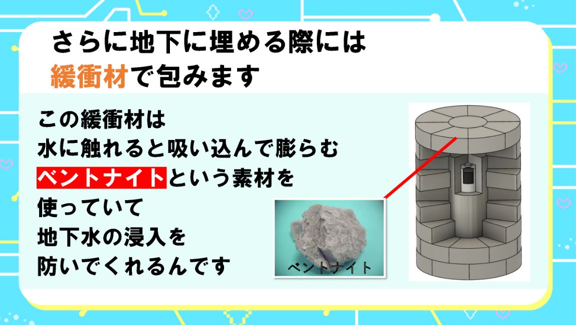 グーモ ガラス固化体は、オーバーパックという金属でできた容器に入れます。埋める際には緩衝材で包みます。この緩衝材は水に触れると吸い込んで膨らむベントナイトという素材を使っていて、地下水の浸入を防ぎます。
